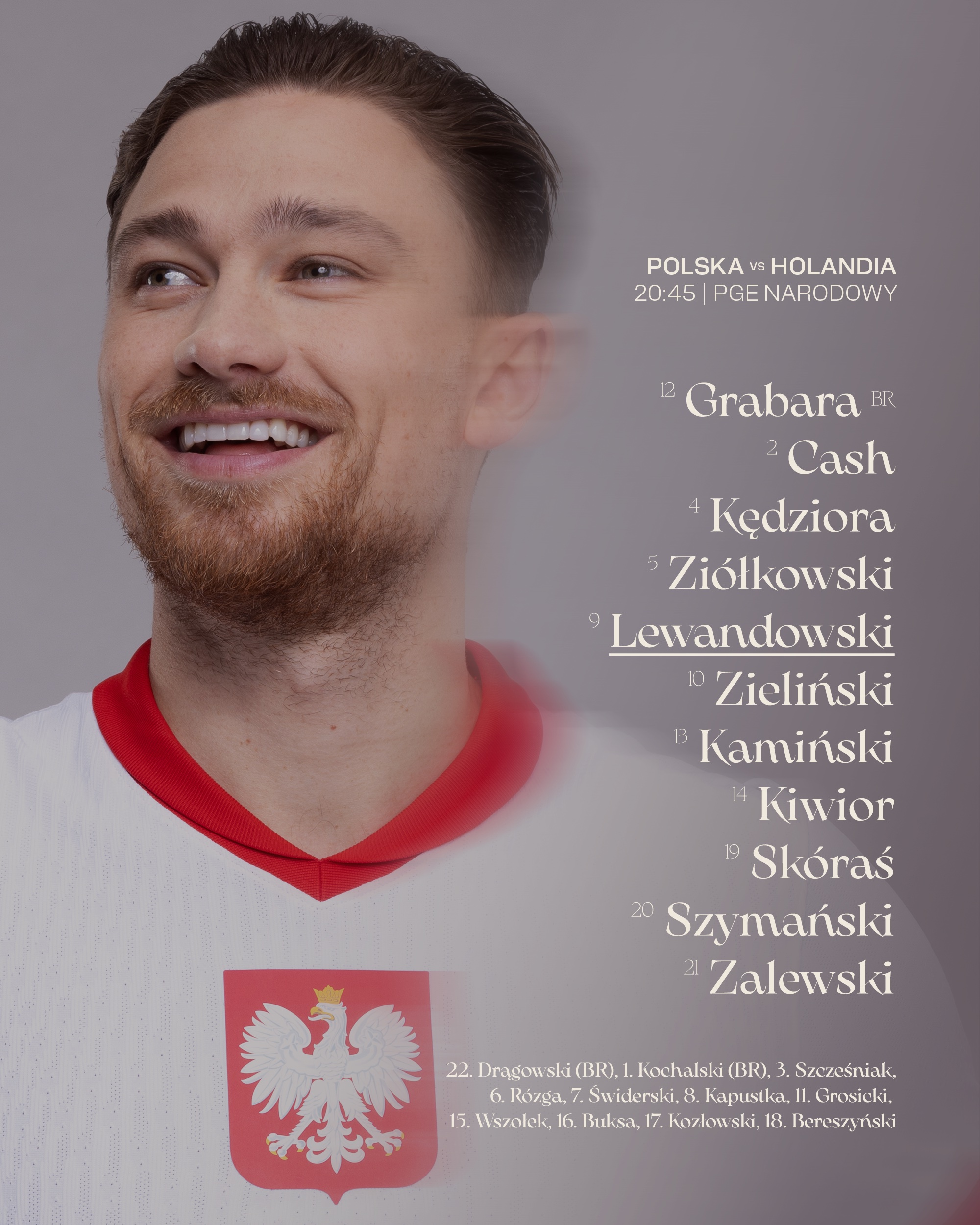 Rezerwowi: Drągowski, Kochalski, Szcześniak, Rózga, Świderski, Kapustka, Grosicki, Wszołek, Buksa, Kozłowski, Bereszyński